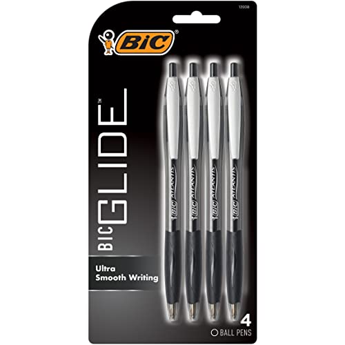 - Experience ultra smooth writing with BIC Glide Black Retractable Ballpoint Pens. These 1.0mm medium point ballpoint pens are great for everyday writing at work, school or home for all of your writing needs. With ultra smooth writing, they’re the ideal ball pens for writing lists, taking notes, journaling and more. BIC Glide Black Retractable Ballpoint Pens are a smart choice for school supplies. Write easily with these retractable pens, which have a comfortable rubber grip. Plus, the metal clip easily attaches to pockets, notebooks and more for quick access on the go. Designed for convenience, these black pens let you start writing with just one click. Every ball pen in this BIC pens bulk pack has a rubber grip for your comfort. With this 4-count pack of medium point pens, you can stock up on dependable BIC ballpoint pens. Looking for reliable pens for school or office supplies?Choose BIC Glide Black Retractable Ballpoint Pens for a high-quality, affordable product you can trust.